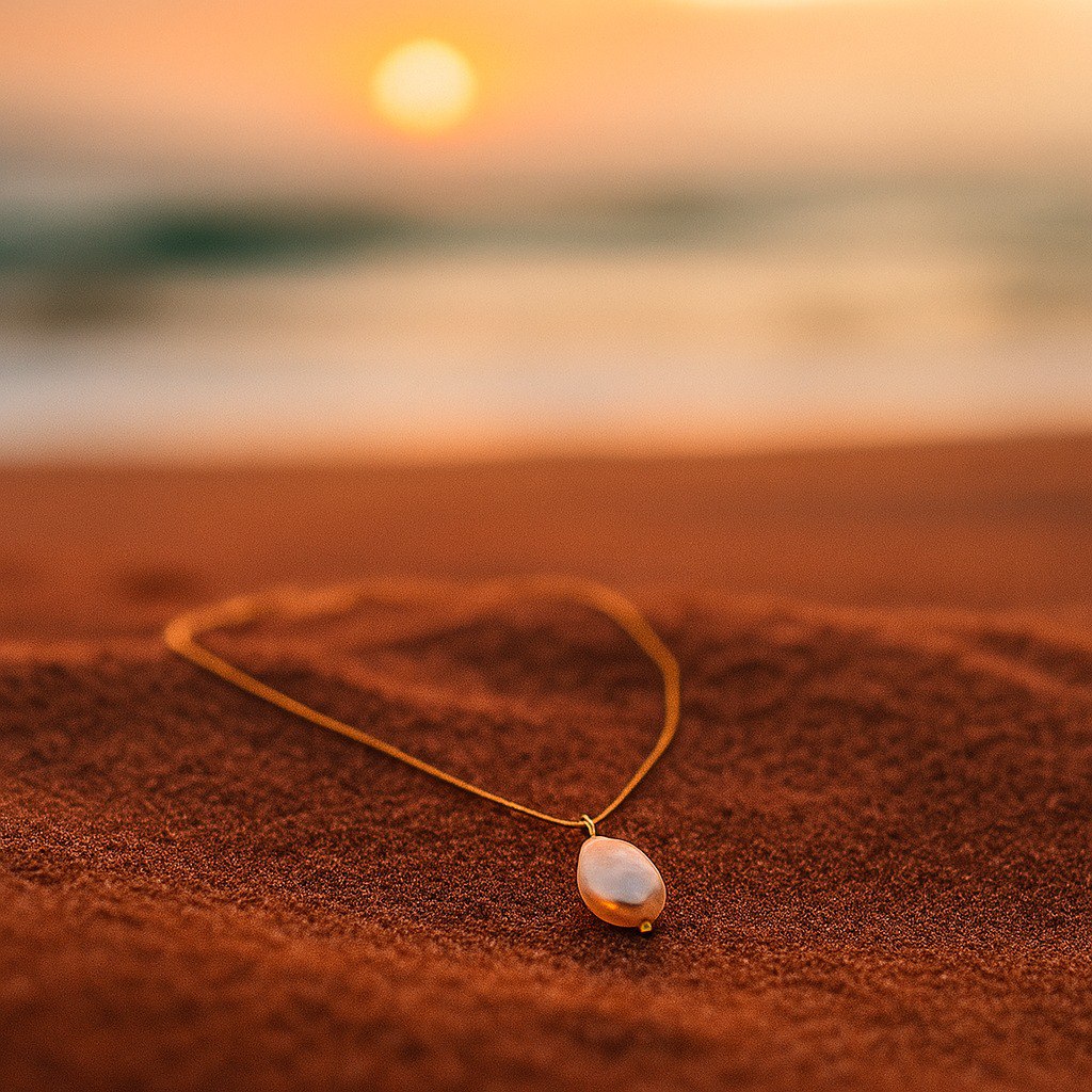 Suspesa its a delicate golden edge, the oval pearl, levigate with cure, riflette the light of a nascosta oasis, silent and promise piena.